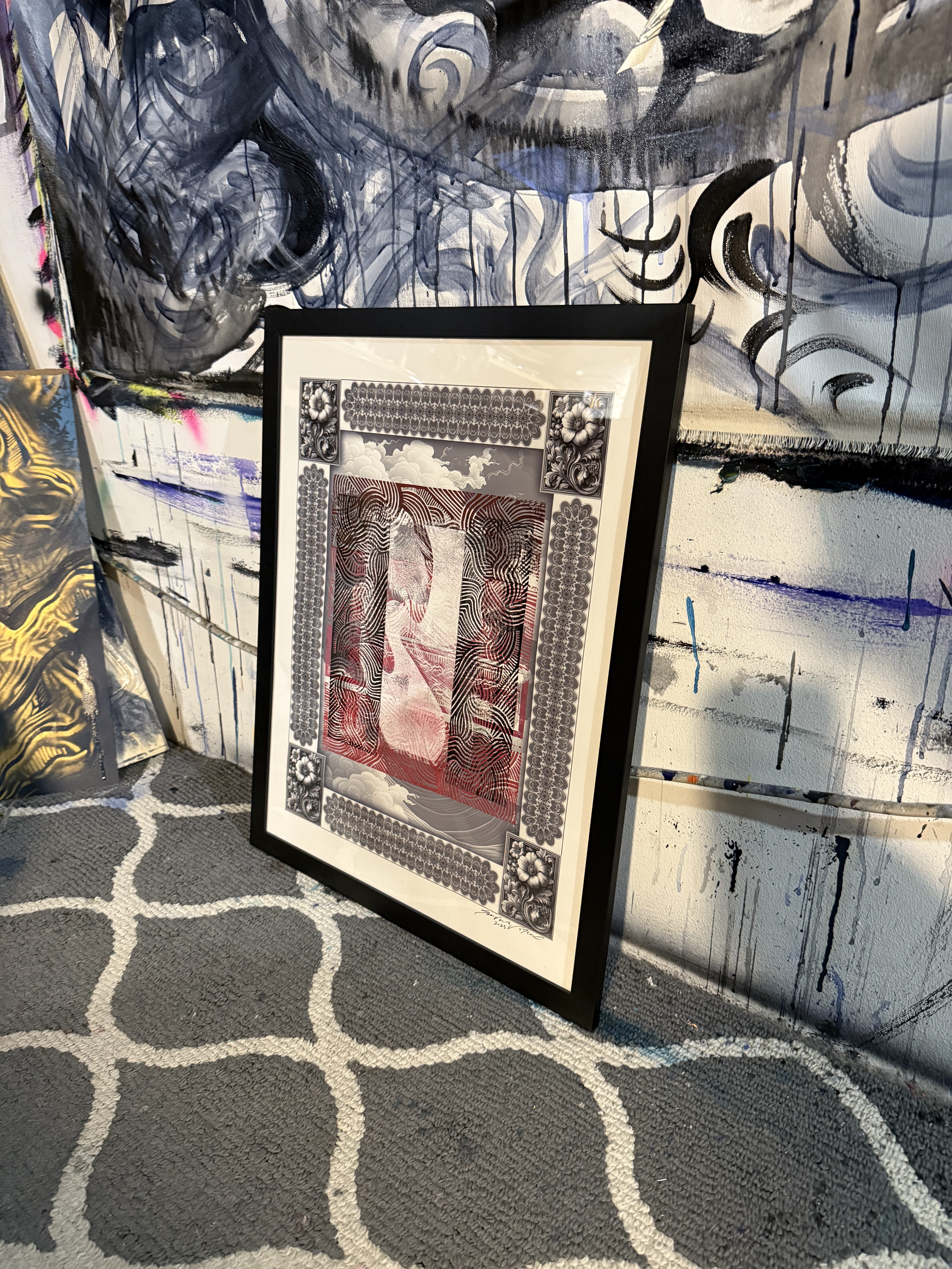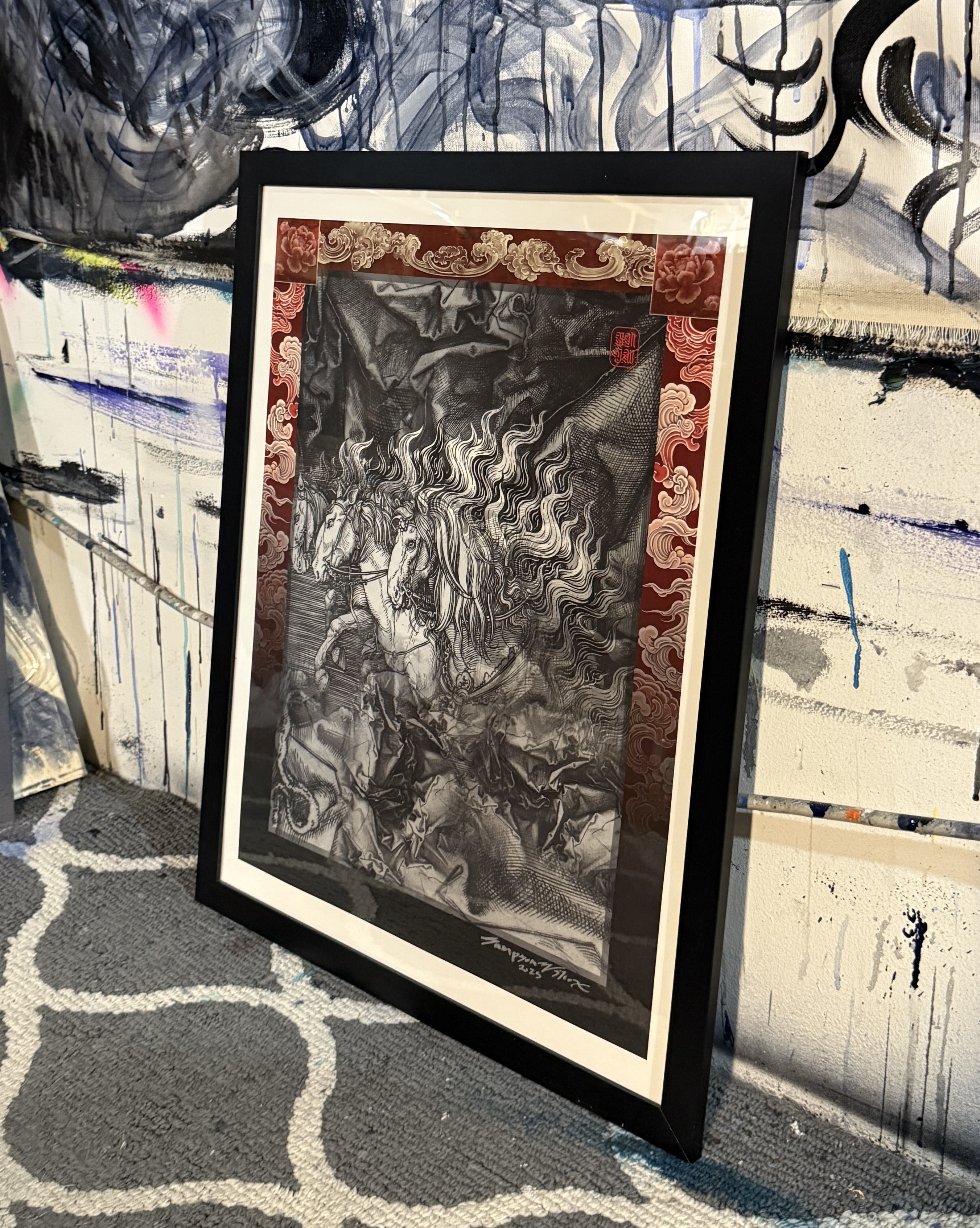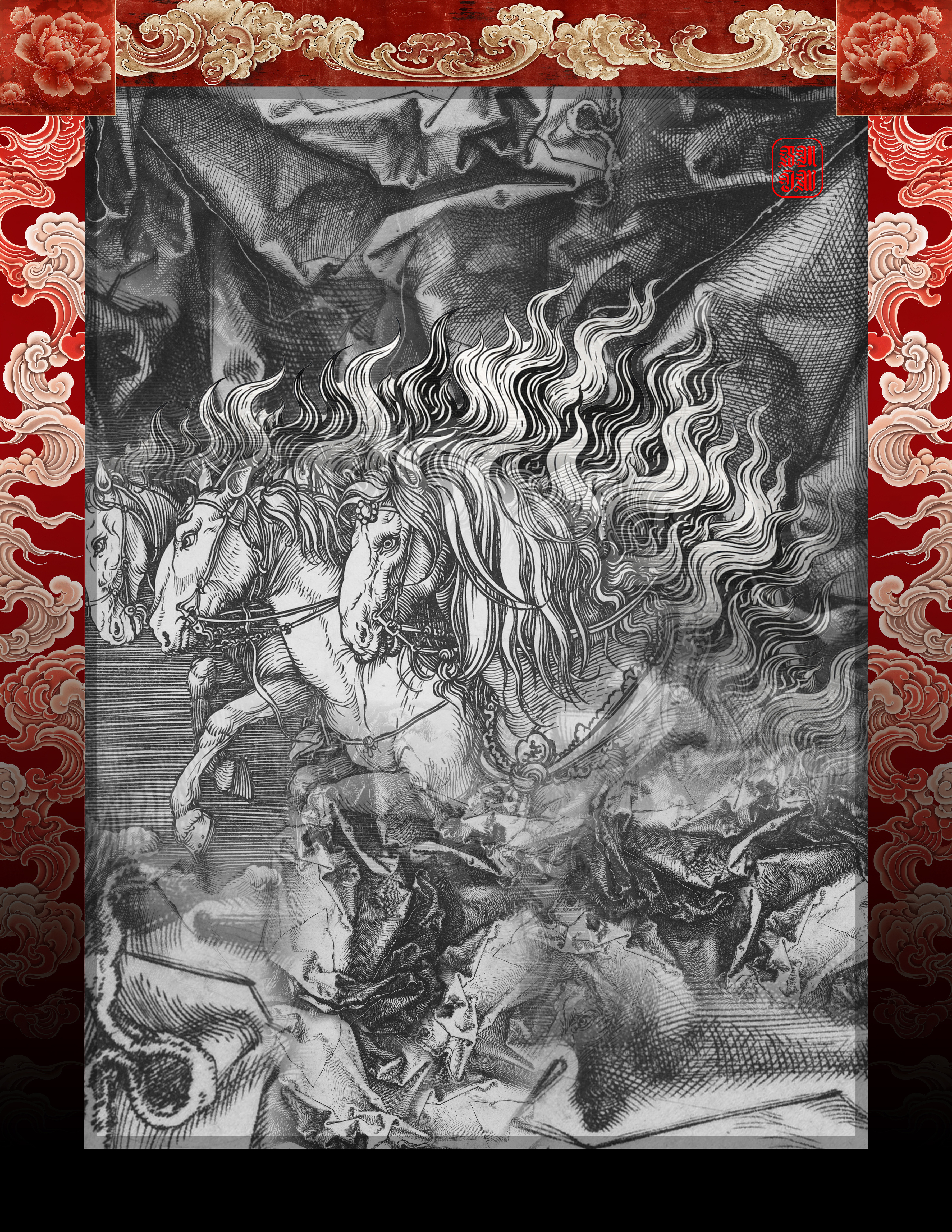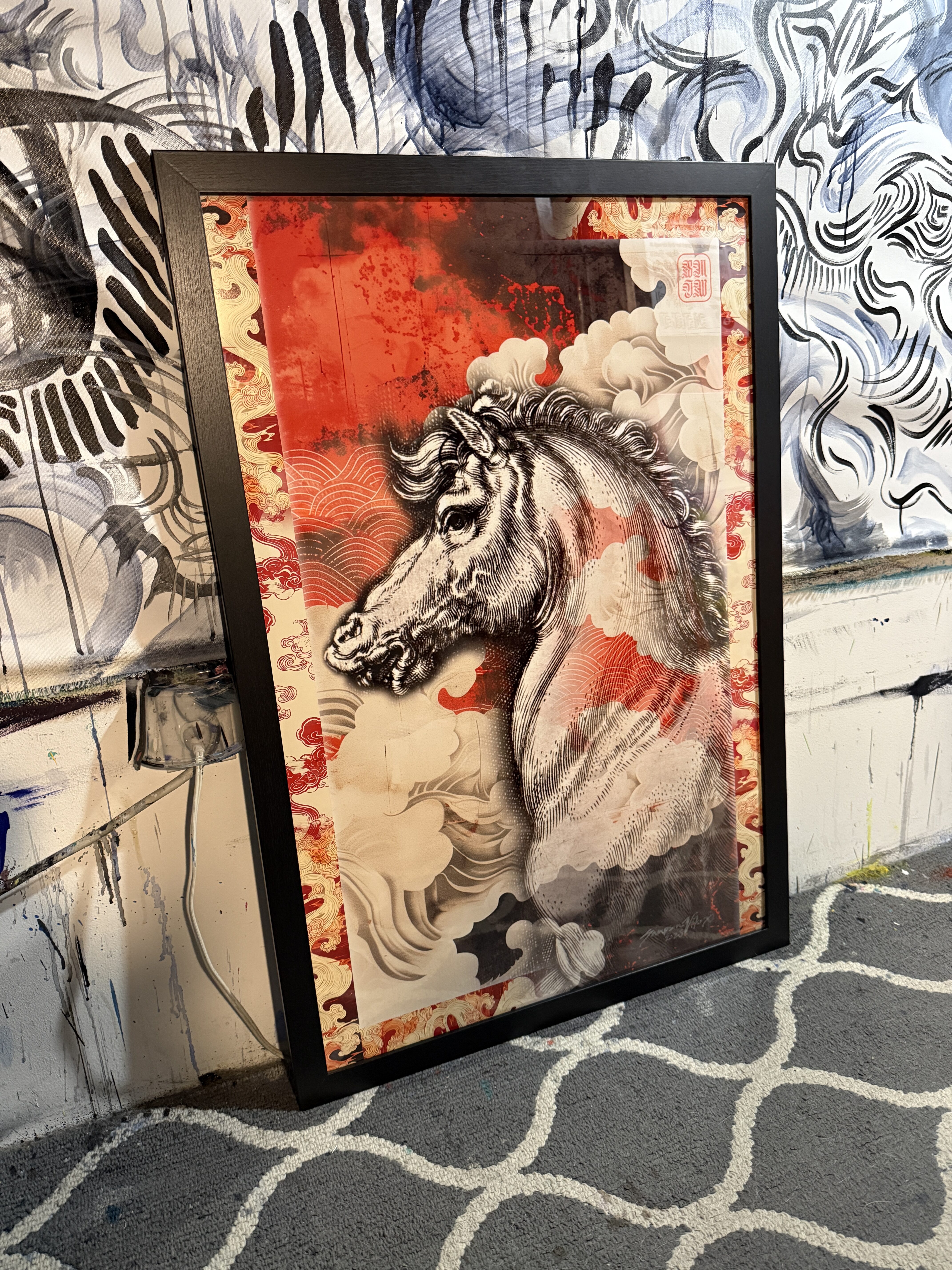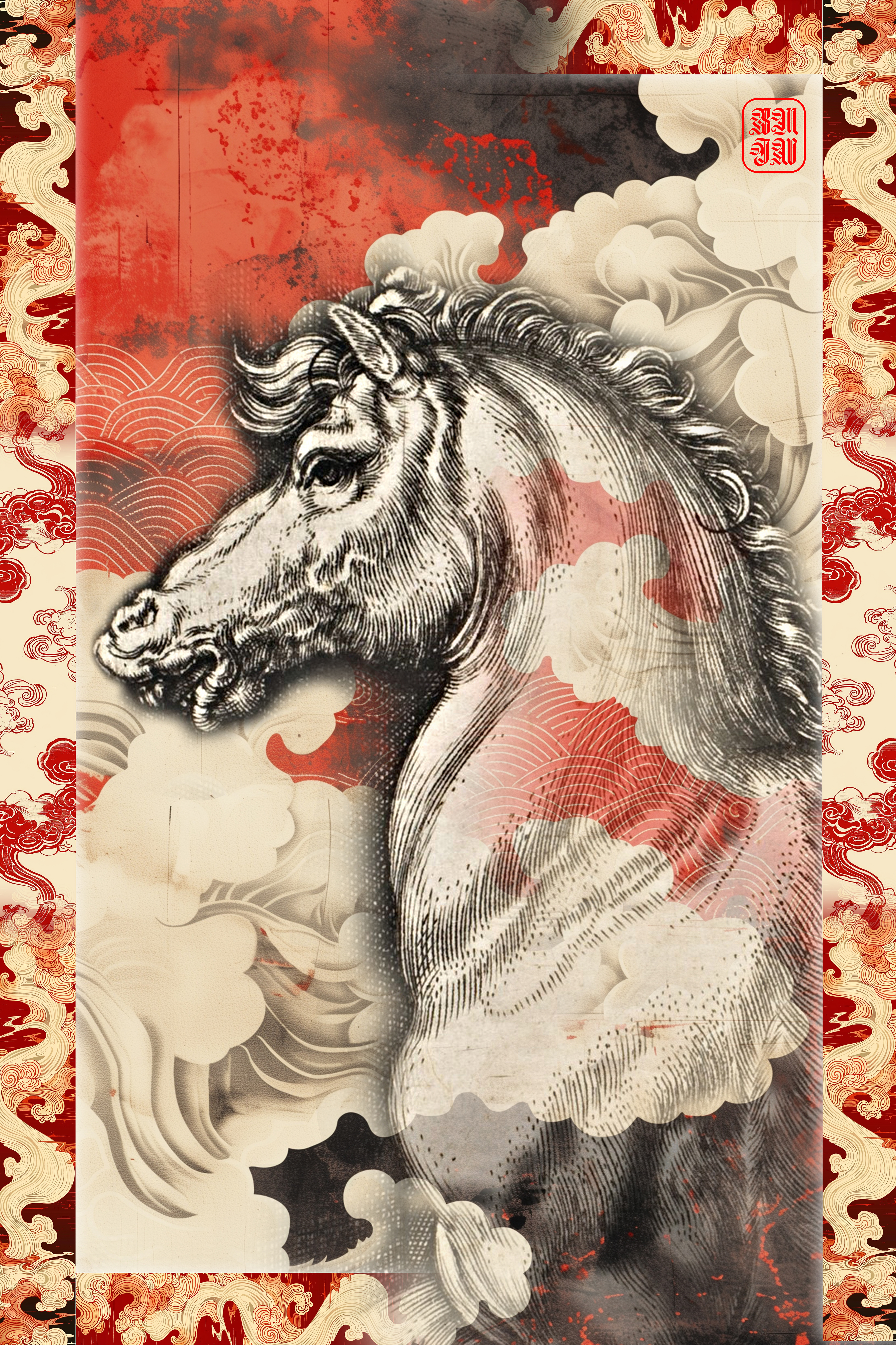 These works draw from Lunar New Year traditions of renewal and forward momentum. The horse—an emblem of vitality and perseverance—moves through ceremonial reds and layered clouds associated with protection and good fortune. Repetition and sweeping gestures echo rituals of clearing the old year, inviting balance, prosperity, and transformation into the new.