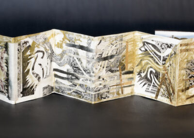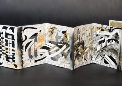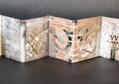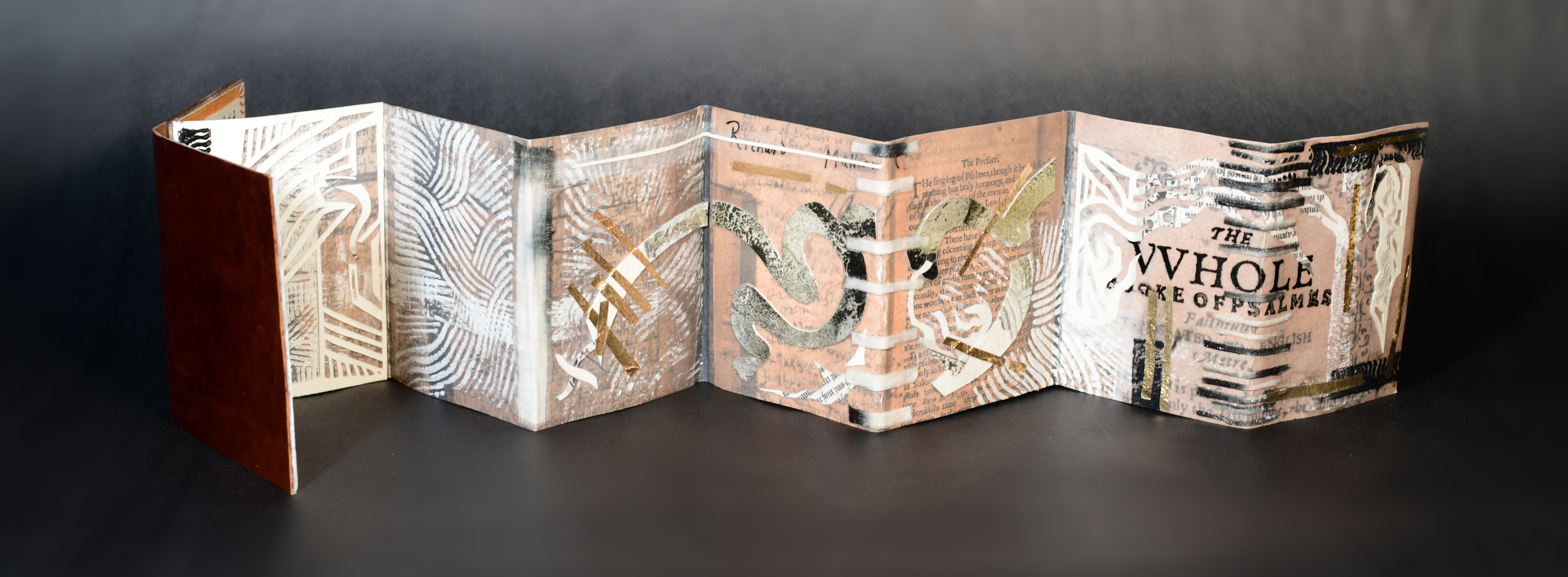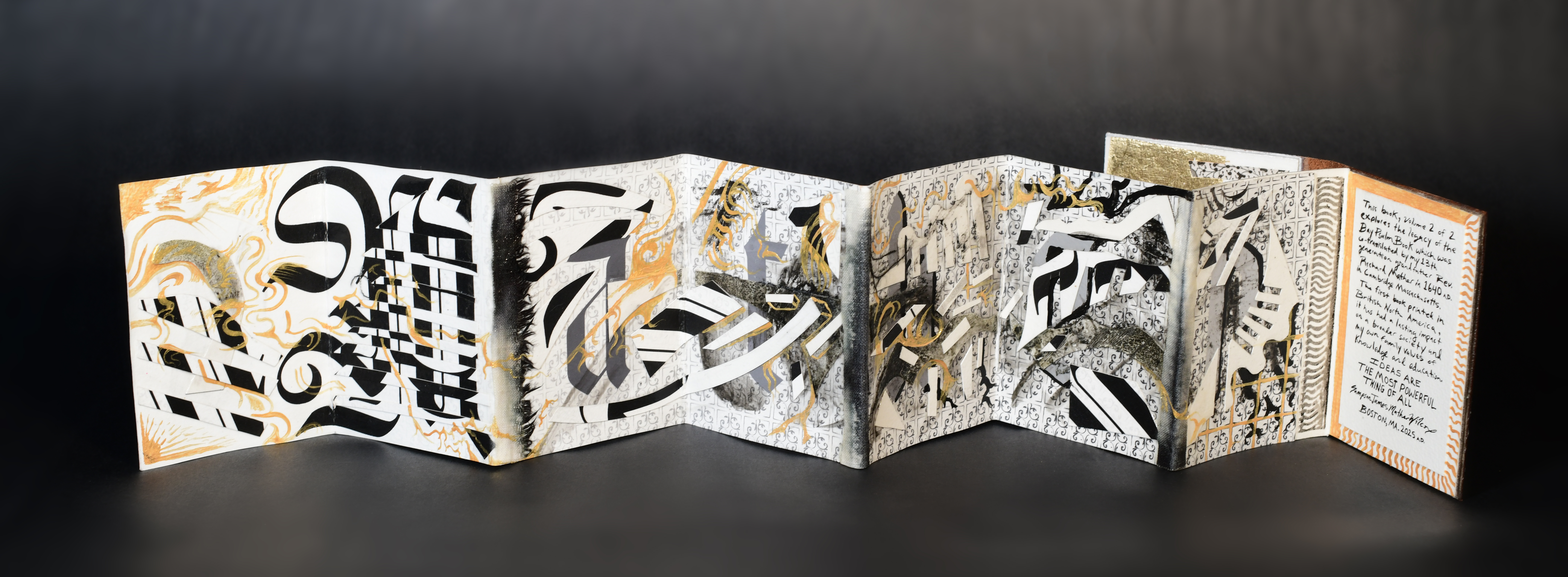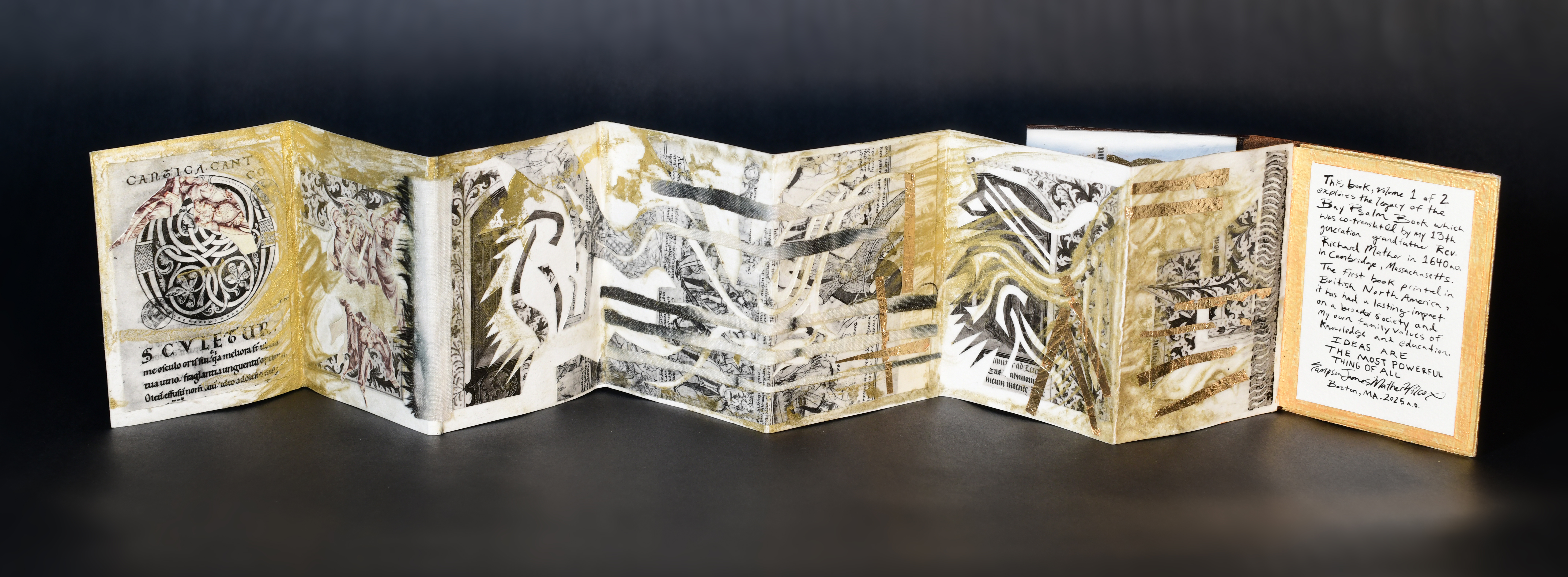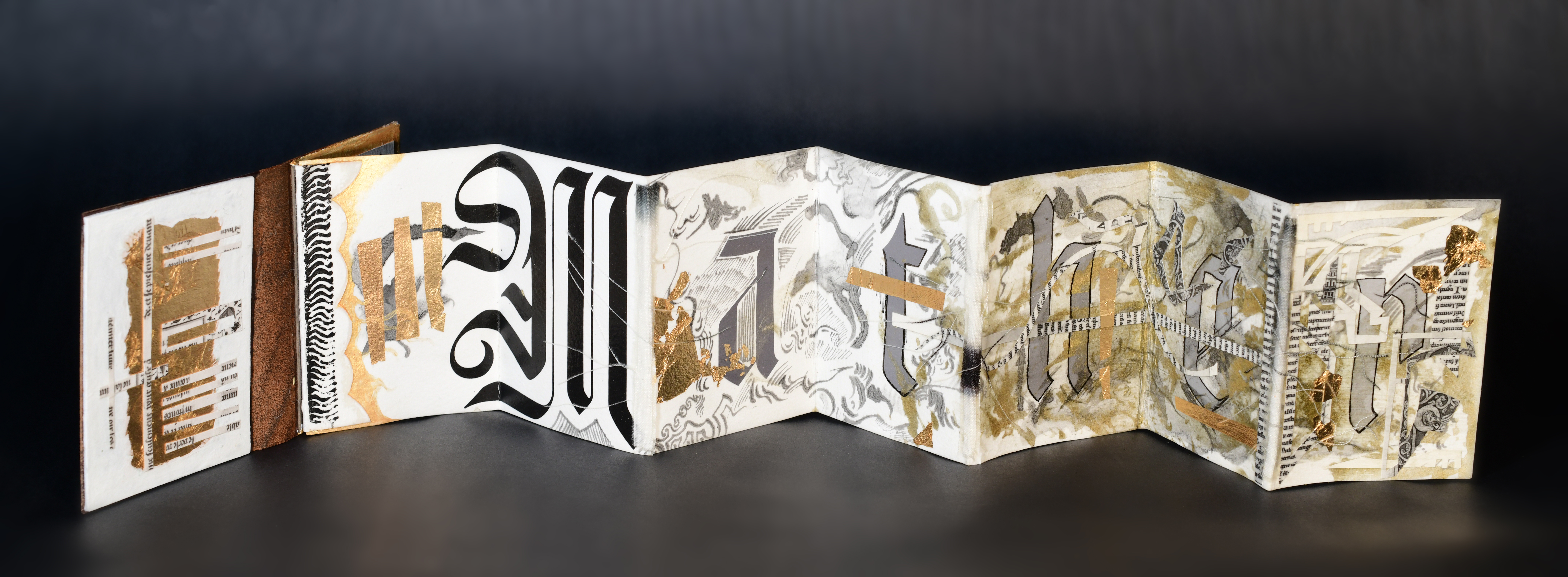 Note: materials include India ink, acrylic paint, collage, gold foil, shibori textile, linocut overprint, leather binding, and fiber cover board. Shibori textile by Amy Nguyen, and Saboneta gothic blackletter typeface by Kevin Cantrell.